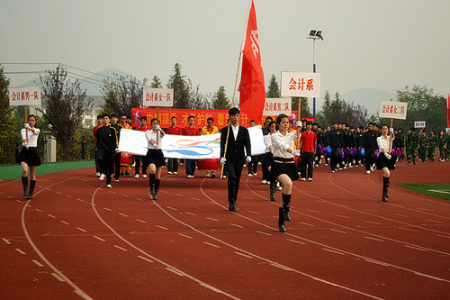 伴随着激昂的运动员进行曲,国旗护卫队、彩旗队、裁判队和学院行政教职工学院各系方阵依次入场。各系同学们面带微笑、英姿飒爽,整齐变换的队形是他们热情的释放,嘹亮激情的口号表达出他们对“更高更快更强”的渴望。