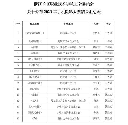 本次摄影比赛是学校工会开展系列手机摄影讲座的一次成果展示,也是丰富教职工文化生活的有效载体,对培养教职工向上向善的审美情操,激发教职工努力拼搏、干事创业的积极性有着积极意义。今后,学校工会将继续开展教职工喜闻乐见的活动,进一步深化工会服务职能,团结带领广大教职工为学校各项事业高质量发展贡献力量。